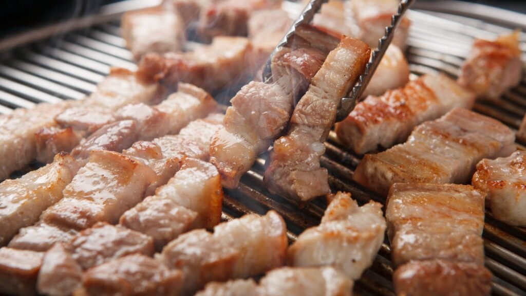 - Samgyeopsal (サムギョプサル): Thick slices of pork belly grilled at the table.